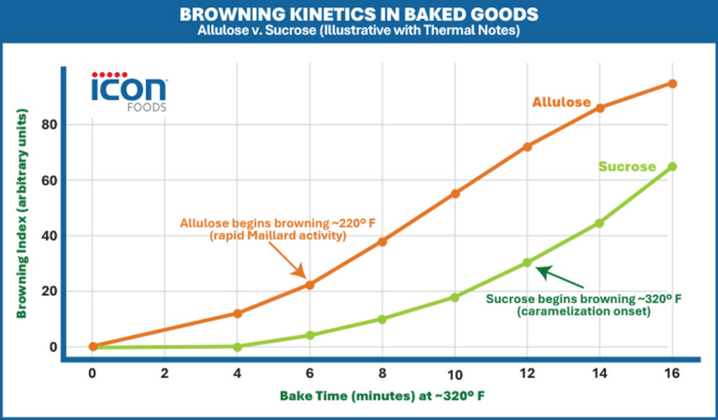 Above is a chart highlighting Maillard reactivity and thermal thresholds for both sweeteners — showing that allulose starts browning around 220°F while sucrose doesn’t caramelize until ~320°F.