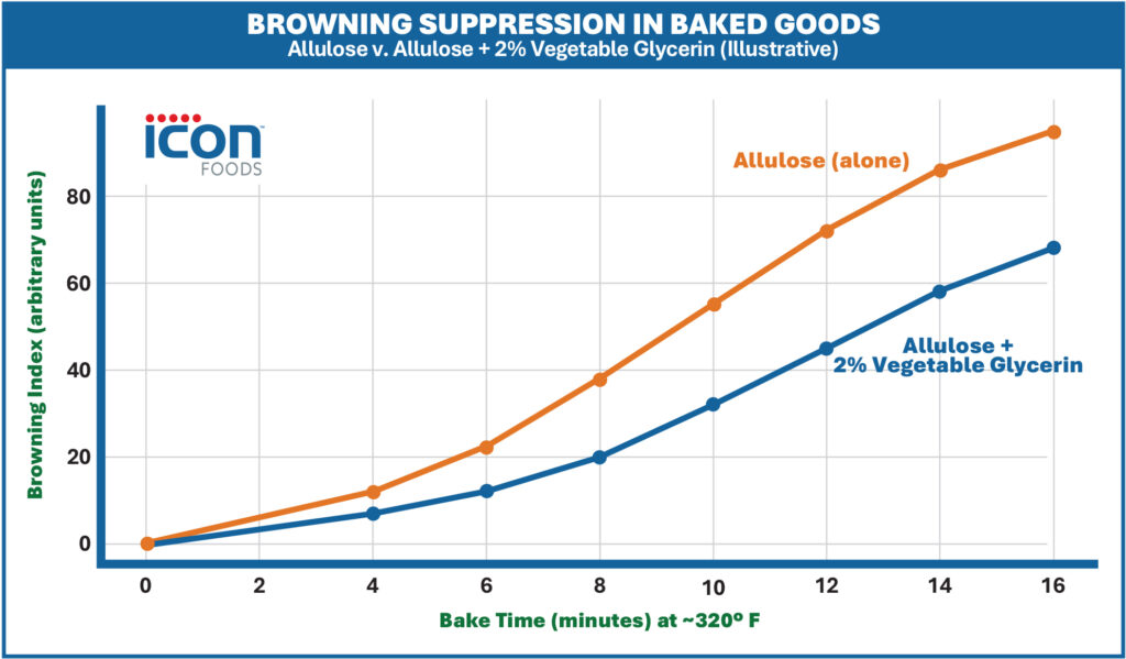 Above is an illustrative chart comparing browning for allulose alone vs allulose + 2% vegetable glycerin across bake time (held around ~320°F).