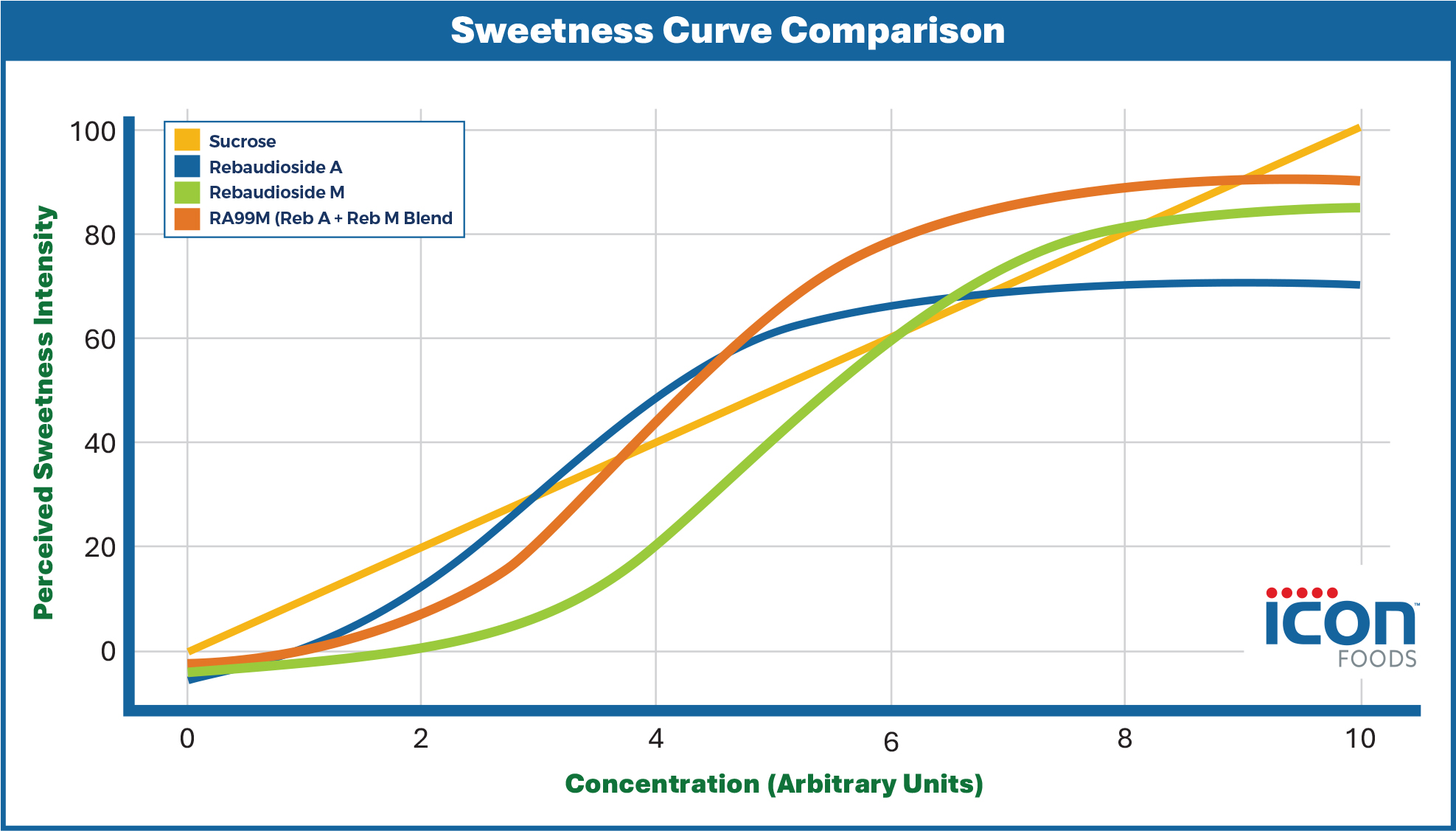 Above is a chart illustrating the sweetness curves of sucrose, Rebaudioside A, Rebaudioside M, and the RA99M blend. It highlights how: