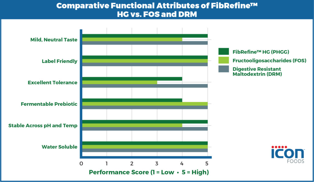 Above is a comparison graph showcasing how FibRefine™ HG (PHGG) stacks up against Fructooligosaccharides (FOS) and Digestive Resistant Maltodextrin (DRM) across key functional formulation attributes.