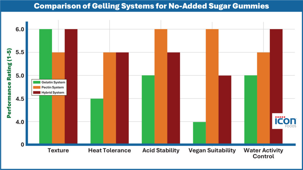 Above is a chart illustrating the performance comparison of gelatin, pectin, and hybrid gelling systems for no-added-sugar gummies.