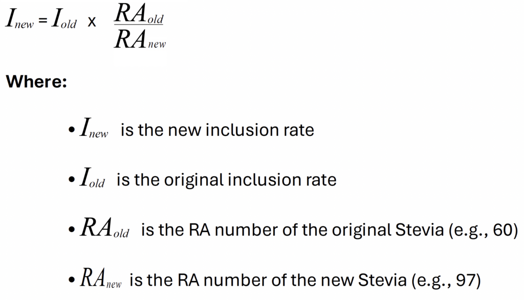 When converting between stevia grades, the goal is to maintain equivalent sweetness intensity while accounting for the change in glycoside purity. The formula is refreshingly simple but incredibly powerful: