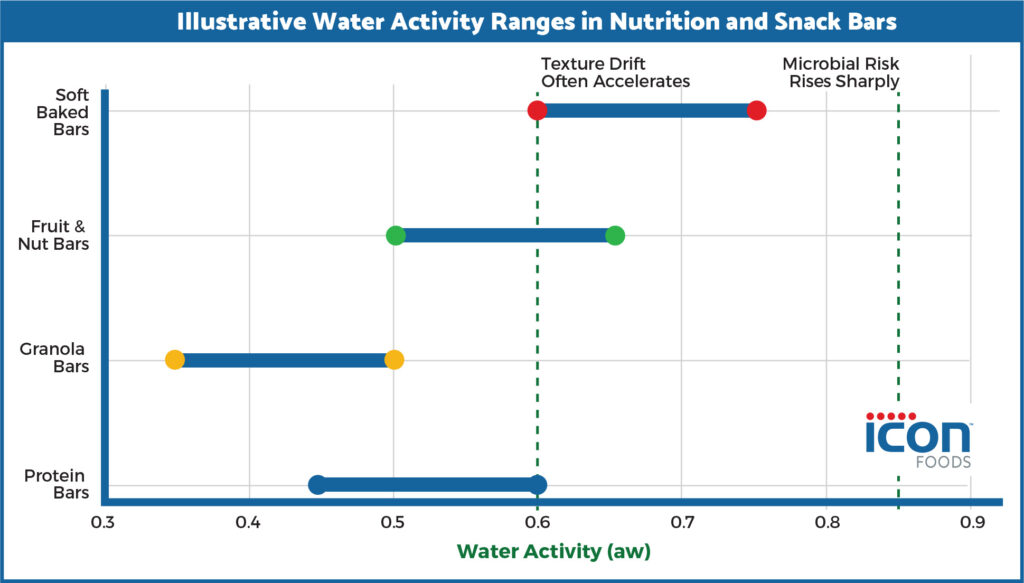 - Granola bars: lower aw, typically ~0.35 to 0.50