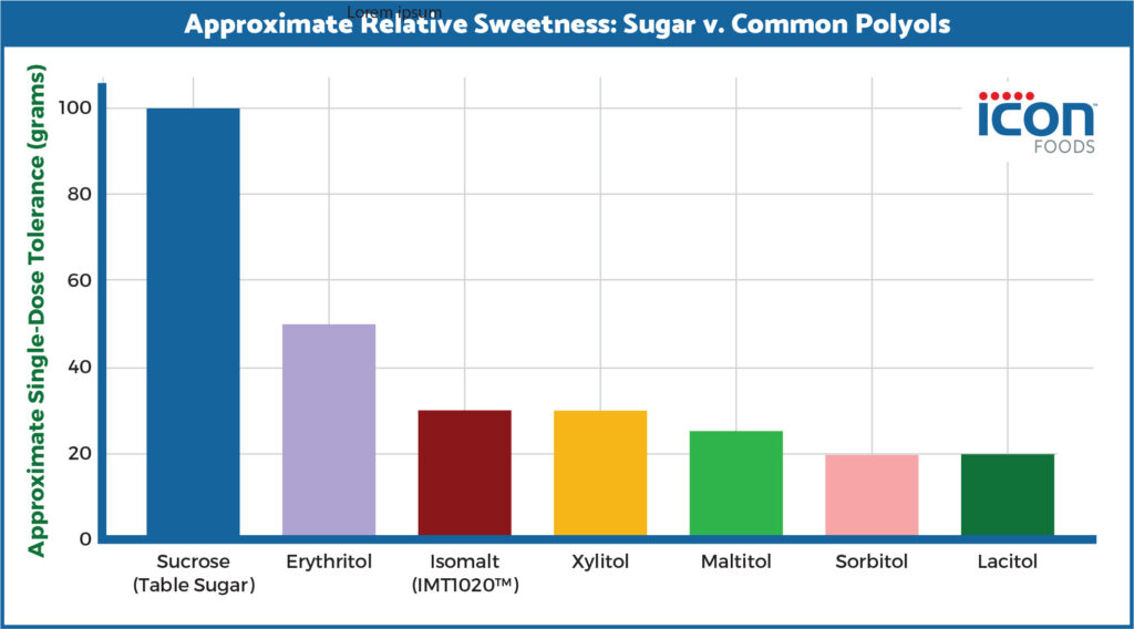 The graph above illustrates relative sweetness comparison (with sucrose = 1.0) across common polyols, including IMT1020™ isomalt.