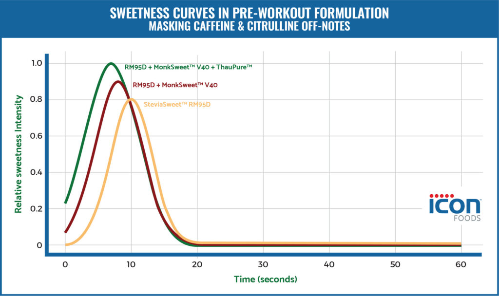 The above graph illustrates sweetness synergy—showing how Reb M alone is clean but narrow, Reb M + Monk fruit broadens the curve, and Reb M + Monk fruit + Thaumatin delivers the fullest, most sugar-like profile with lingering sweetness that masks caffeine/citrulline bitterness.
