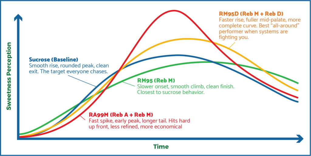 • RM95 (Reb M) delivers the cleanest, most sugar-like profile. Smooth, controlled, and relatively free of bitterness when used correctly.