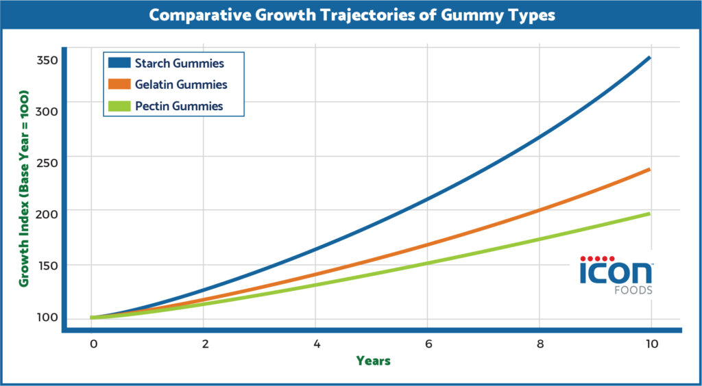The above graph illustrates comparative compounded growth trajectories for starch, gelatin, and pectin gummies using a simple indexed model (base year = 100 over 10 years).